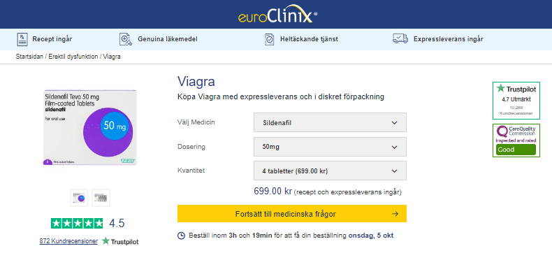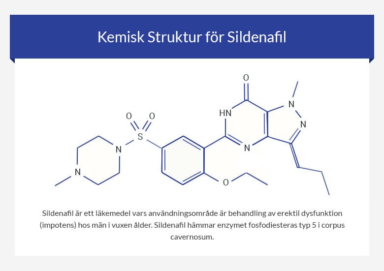 Viagra används vid erektil dysfunktion. Blodflödet till penis ökar så att svällkropparna fylls med blod, men man får ingen effekt om man inte blir sexuellt upphetsad och får sexuell stimulering. Det är med andra ord på det viset att Viagra endast fungerar i en sexuell situation. Det är rekommenderat att man tar Viagra cirka 1 timme innan planerad sexuell aktivitet då medlet börjar verka inom 30-60 minuter. Sedan verkar det i kroppen cirka 4 timmar, men det betyder inte att man har en 4 timmar lång erektion. Skulle detta ändå hända så ska man konsultera en läkare. EuroclinixRecept ingårFri frakt + Flest produkterBesökRecept ingår | Leverans inom 1-2 dagar | Betalsätt: Klarna, Trustly, Mastercard, Visa 121DocRecept ingårFri fraktBesökRecept ingår | Leverans inom 1-2 dagar | Betalsätt: AmericanExpress, Trustly, Klarna, Visa, Mastercard ShytobuyGMP-certified and GMO-FreeGratis frakt vid köp över 599 krBesökRecept ingår | Leverans 1-3 dagar | Betalsätt: Klarna, Trustly, Mastercard, Visa, Swish Köpa Viagra online Man kan köpa viagra hos apotek online i Sverige via våra Svenska nätapotek men man måste dock se till att ha ett recept innan man besöker nätapoteket. Viagra tabletter I England har man tex inget recept för Viagra och dom som köper viagra online får ett giltigt recept av en läkare. Något liknande hoppas vi att Sverige också kikar på i framtiden så att de Svenska nätapotek också kan sälja den här medicinen även till de som skäms för att besöka läkaren eller apoteket. Vad är erektil dysfunktion? Erektil dysfunktion, eller impotens, som det också kallas, är relativt vanligt och det finns många olika orsaker som kan ligga bakom. Det är inte svårt att avgöra om man lider av detta problem, utan det är helt enkelt så att om man har ett problem med att penis inte blir hård i sexuella sammanhang så har man erektil dysfunktion. De flesta män drabbas åtminstone någon gång i livet av detta och beroende av när i livet man befinner sig, situationen det sker i med mera så är det så att orsaken bakom skiftar. Bland annat är det vanligt att det händer på grund av stress, drog- alkoholintag, rökning, dålig motion, ålder, psykiska besvär så som depression med mera. Det finns läkemedel, ofta den typen som används vid psykiska besvär, som ger erektil dysfunktion, men detta blir man informerad av antingen av läkaren som skriver ut dem, eller via bipacksedeln som medföljer medicinen. En annan orsak som är relativt vanlig är att det handlar om att relationen till den person man har sex med är dålig av en eller annan anledning. Erektil dysfunktion har ofta att göra med psykiska problem i allmänhet, så har man sex med en person som man har en jobbig relation till i övrigt så kan detta påverka och bli ett problem. Erektil dysfunktion handlar inte endast om att man har svårt att få erektion, utan det handlar även om det problem där man har svårt att behålla sin erektion en längre tid. Detta innebär att man kanske inte har problem med att få en eregerad penis, men att erektionen försvinner snabbt. Det är så att en erektion uppstår med hjälp av ett enzym kallat cGMP och vid sexuell upphetsning orsakar detta enzym att blodkärlen i penis slappnar av, vilket leder till att mer blod kan flöda till penis och göra den eregerad. Ett annat enzym, fosfodiesteras typ 5, bryter ner cGMP och gör istället så att blodet flödar ut ur penis, vilket gör att erektionsproblem inträffar. Vad innehåller Viagra? Viagra innehåller sildenafil, vilken tillhör en grupp mediciner som verkar genom att underlätta för blodkärlen i penis att vidga sig så att blodet kan flöda medan du är sexuellt stimulerad. Detta ämne används även för att sänka blodtrycket i blodkärlen i lungorna, så kallad PAH (pulmonell arteriell hypertoni). Man kan få läkemedlet både som tabletter och i flytande form. Tabletterna kommer i de olika styrkorna 20, 25, 50 och 100 mg. Det finns även sildenafil som injektionsvätska, vilket man får på sjukhus. Man kan ta tabletterna med eller utan mat, men man bör tänka på att inte blanda det med stora mängder alkohol eller stora mängder mat. Som med vilka tabletter som helst är det så att man tar dem med lite vatten, så det är inga svårigheter att ta Viagra. är det istället så att du har Viagra i flytande form så ska du skaka flaskan i minst 10 sekunder innan du tar en dos, eftersom det gör så att innehållet blandas ordentligt. Som nämnt ovan så fungerar sildenafil på det viset att det ”krigar” med fosfodiesteras typ 5 som, tvärtemot från sildenafil, vill att blodet ska flöda ut ur penis istället för att flöda till penis. Då Viagra är receptbelagt är det också så att du har en dos som är anpassad till just dig. Denna dos ska man alltid hålla, eftersom det är farligt att dosera på annat sätt utan att rådfråga läkare. Vanlig dosering brukar vara 1 tablett på 50 mg cirka 1 timme innan sexuell aktivitet och är det så att denna dos känns för låg så är det bara att rådfråga läkare för att se om det går att öka dosen. Gör inte detta på eget bevåg! Sildenafil under olika namn: Förutom just Viagra så finns det även en mängd andra läkemedel som innehåller samma aktiva substans, sildenafil. Exempel på andra läkemedel innehållandes detta ämne är följande: Sildenafil Teva/Accord/Actavis/Navamedic/STADA/Teva Pharma/Pfitzer/1A Farma Balcoga Revatio Granpidam Revastad Idilico Orisild Mysildecard Detta är ingenting ovanligt med läkemedel, utan det finns alltid många olika tillverkare av samma läkemedel. Det är aldrig den aktiva substansen som skiljer sig åt, utan det är så kallade hjälpämnen som skiljer sig åt. Det är ofta på det viset att det skiljer sig åt mycket i pris beroende av vilken tillverkare som ligger bakom medicinen. Ofta är det så att det företag som först introducerade läkemedlet på marknaden behåller